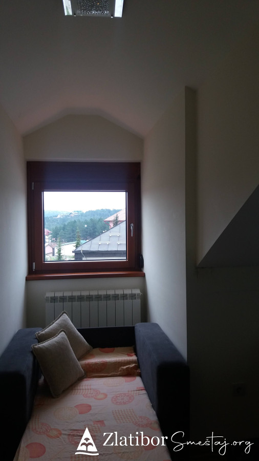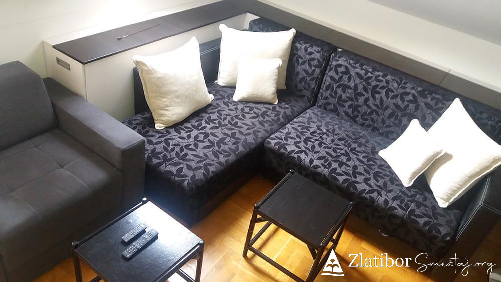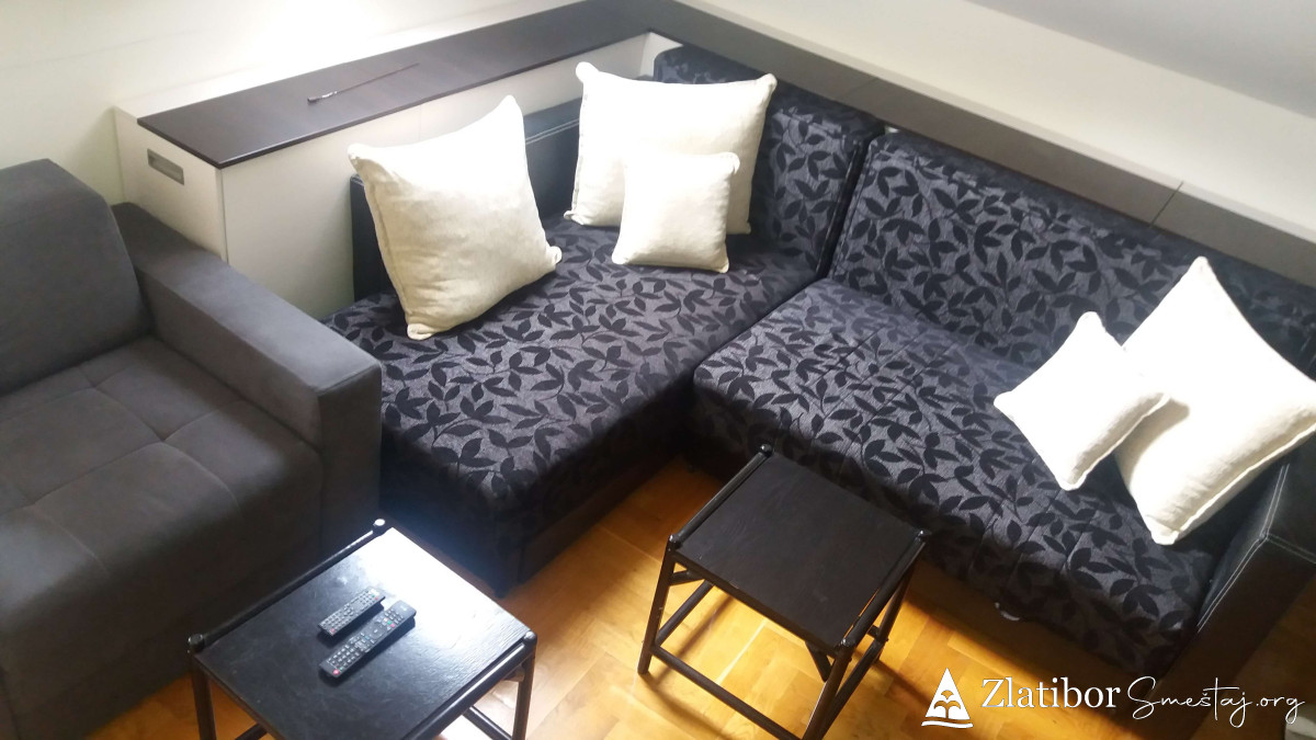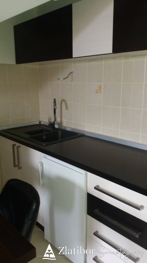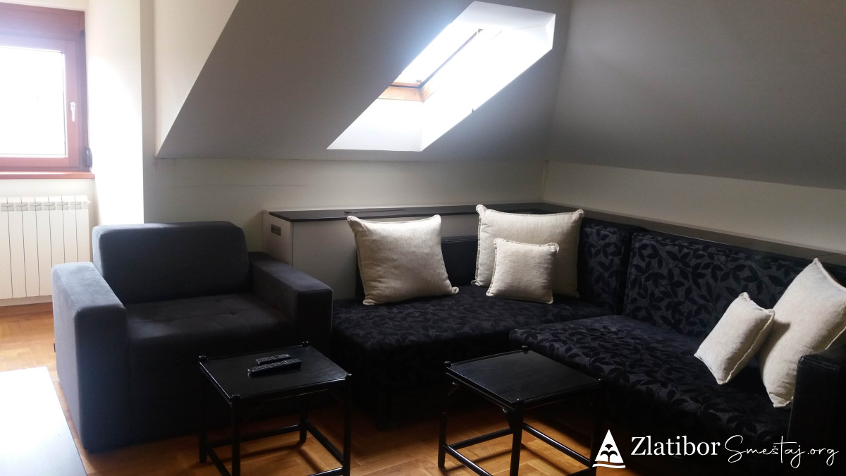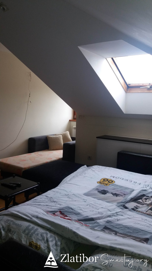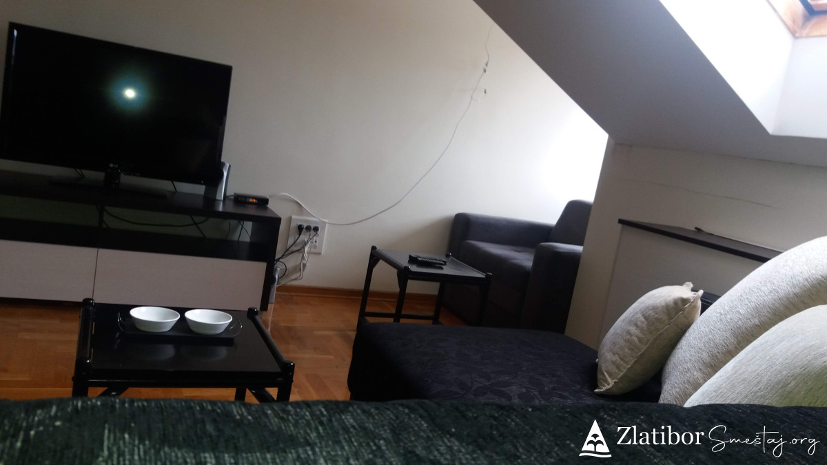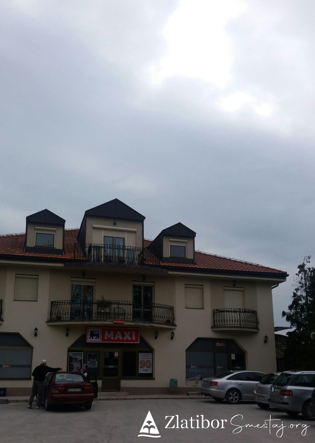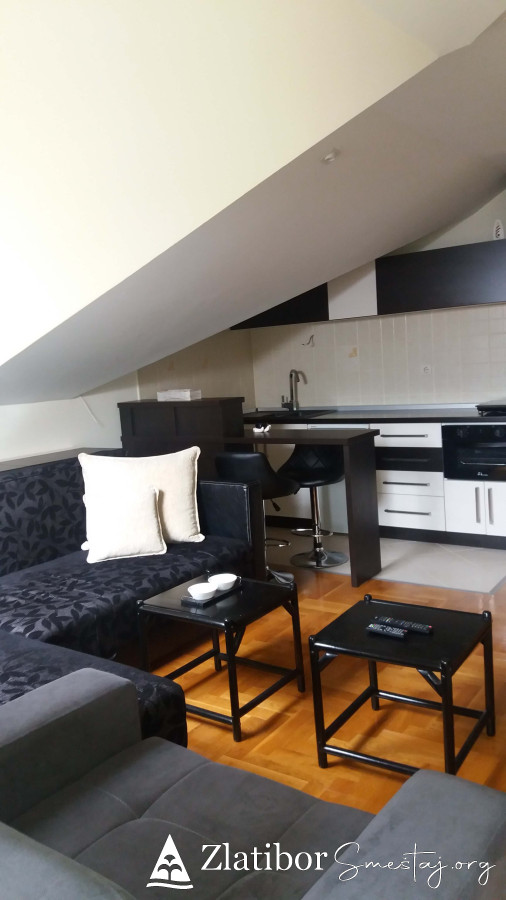 Moderno opremljen apartman povrsine30m2, smestajnog kapaciteta do 3 odrasle osobe ili dvoje odraslih sa dvoje dece. Udaljen je samo 5 minuta laganog hoda od centra Zlatibora. Nalazi se u zgradi marketa "mini-MAXI" na poslednjem spratu kao i pored odmaralista Golija. U sklopu apartmana je opremljena kuhinja, kupatilo sa tuš kabinom, kao i posudje, posteljina, peskiri, fen, usisivac. U prizemlju zgrade je odlicno snadbeven market, ispred parking a nepostedno pored je igralište za decu kao i dosta pravaca za duge i ugodne setnje.