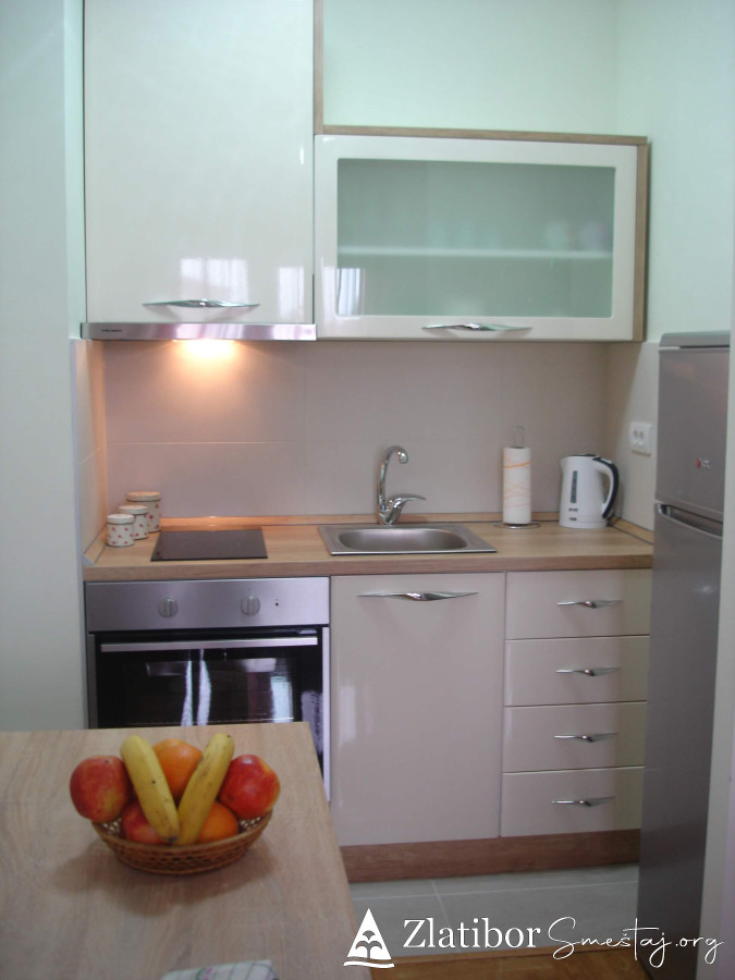 Apartman je nov i moderno opremljen. Poseduje : dnevni boravak, kompletno opremljenu kuhinju, spavaću sobu, kupatilo, terasu.