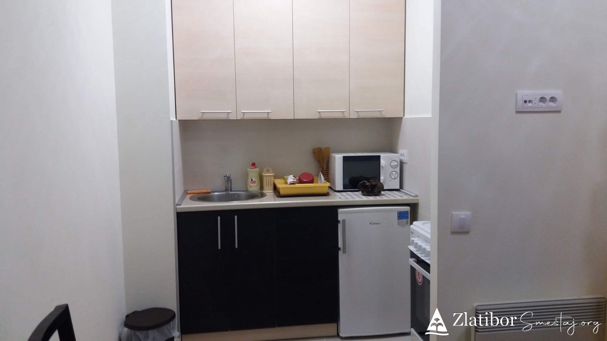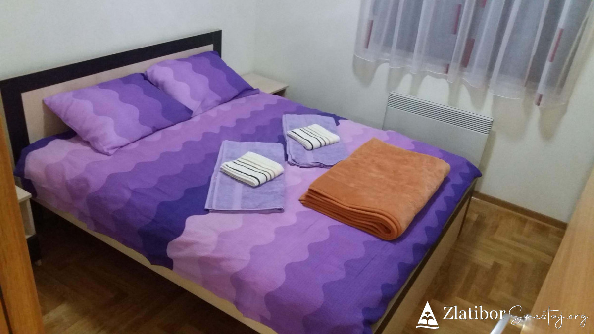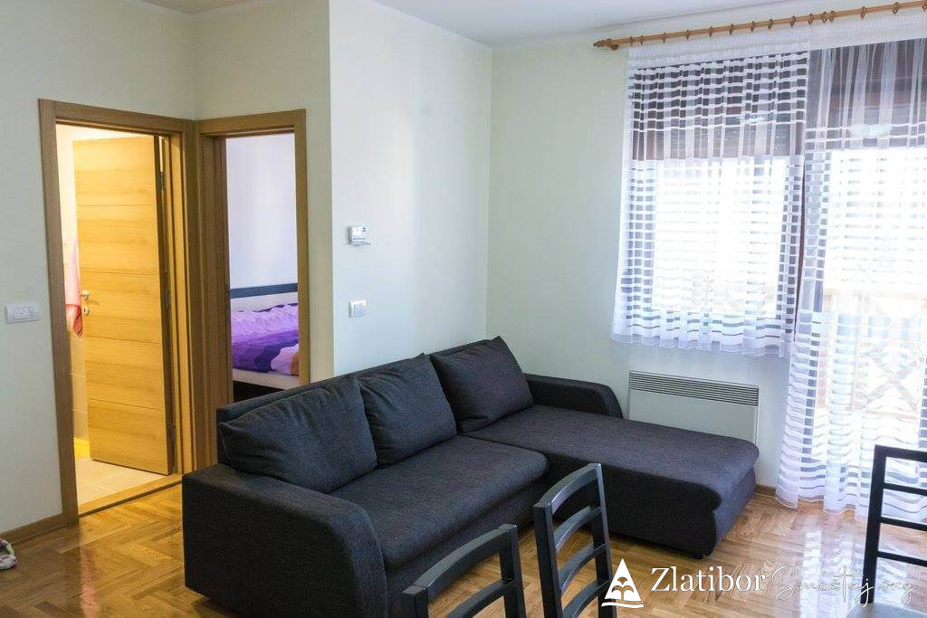 Apartman se nalazi na 400m od autobuske stanice. Smešten je na drugom spratu zgrade koja poseduje panoramski lift i ima terasu sa pogledom na planinu. Pored toga, apartman je u potpunosti opremljen, poseduje kuhinju sa svim neophodnim uredjajima, kupatilo i spavaću sobu sa francuskim ležajem, parking, kao i internet i kablovsku televiziju. Dnevni boravak poseduje ugaonu garnituru na razvlačenje i zasebnu spavaću sobu pa je pogodan za boravak do 4 osobe.