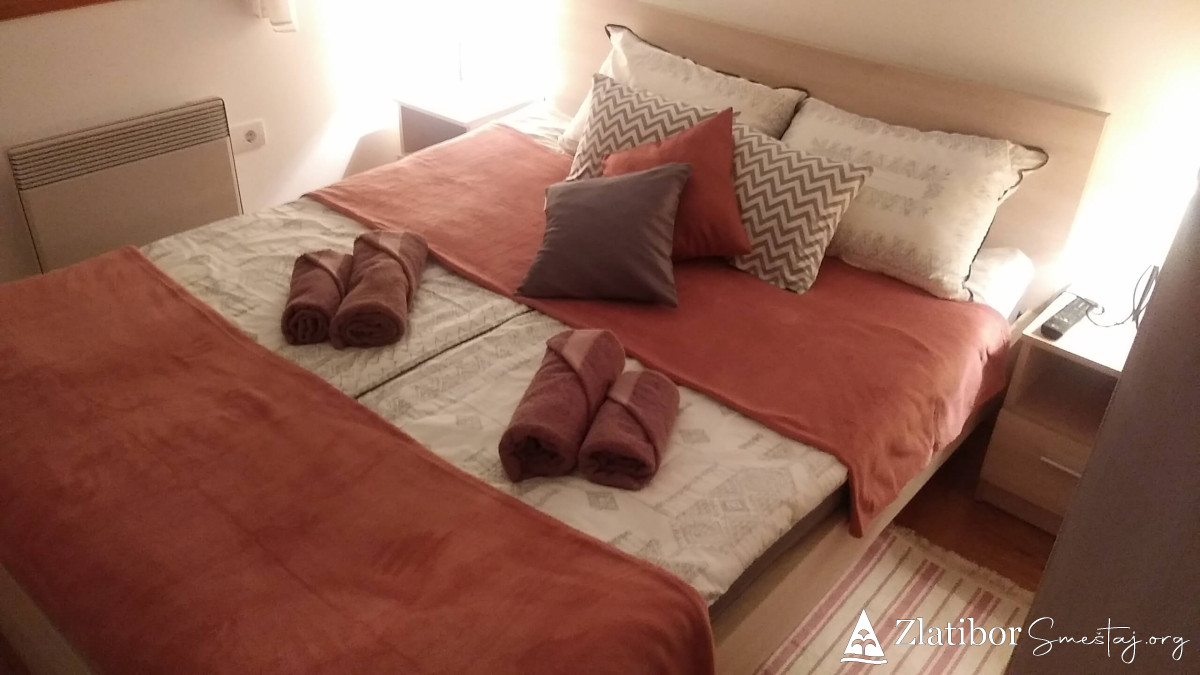 Po ulasku u apartman sa leve strane se nalazi svetla spavaća soba u modernom planinskom stilu, sa francuskim ležajem, američkim plakarom i kablovskim LCD TV.