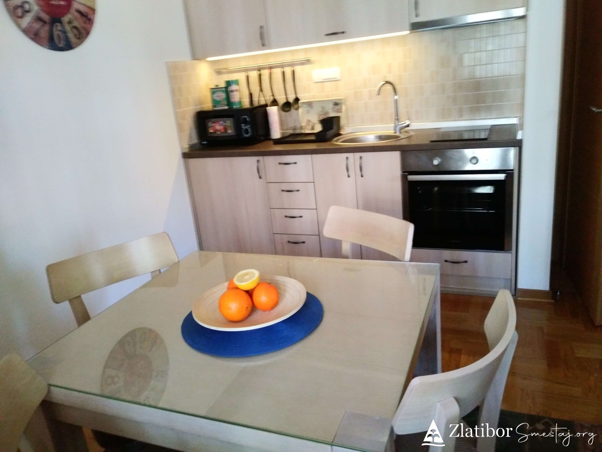 Nasuprot spavaće sobe je kupatilo sa tuš kabinom i WC. Pravo hodnikom je dnevni boravak sa trpezarijom i kuhinjom, moderno opremljenom sa svim pratećim sadržajima. Dnevni boravak odiše toplinom koju daje skriveno ambijetalno svetlo, a drvene zidne obloge daju poseban doživljaj planinskog ambijanta. Dnevni boravak je opremljen ugaonom garniturom na razvlačenje, kablovskim LED 3D smart TV, kućnim bioskopom i wi-fi. Iz dnevne sobe se izlazi na prostranu terasu sa pogledom na borov park i zlatiborsku panoramu.Terasa je potpuno obložena drvenim oblogama i čini pravu konkurenciju dnevnom boravku i dvorišnom letnjikovcu. Mogućnosti za uživanje su tu…