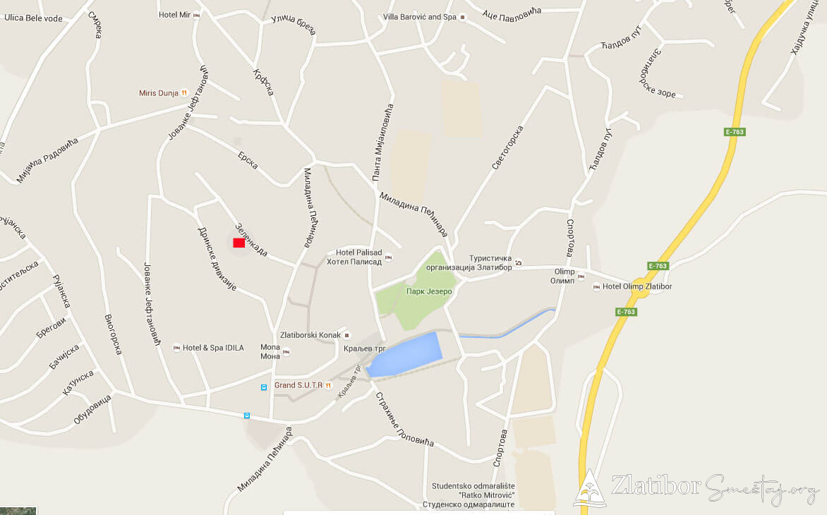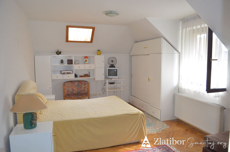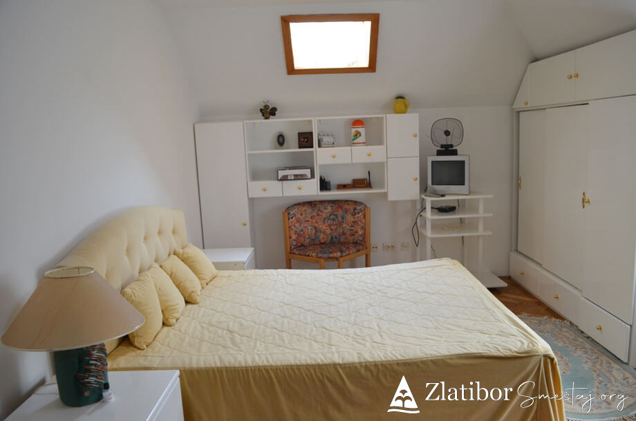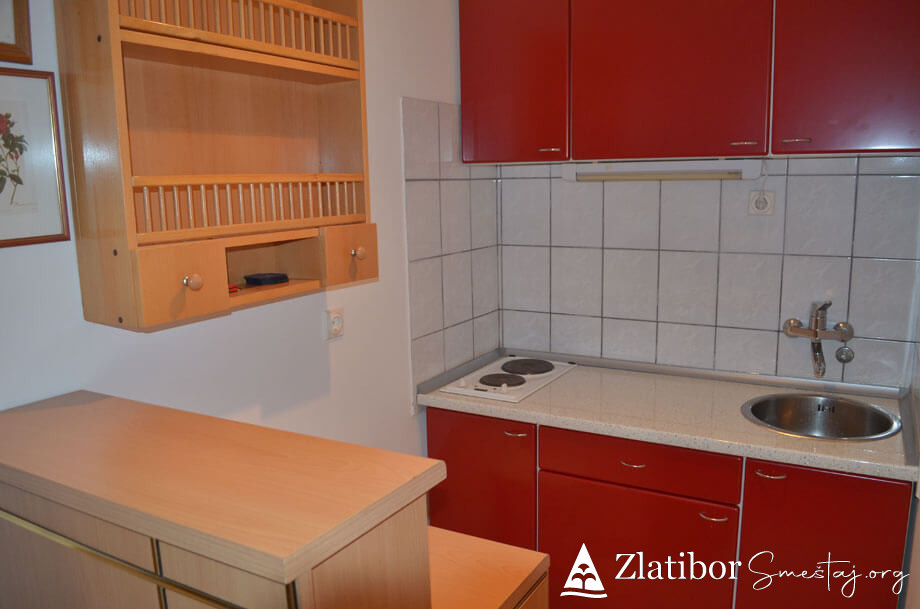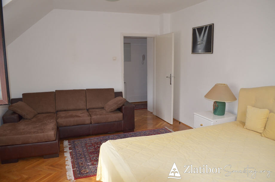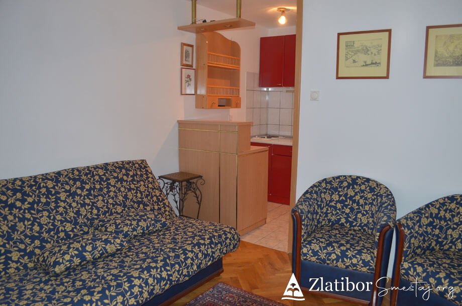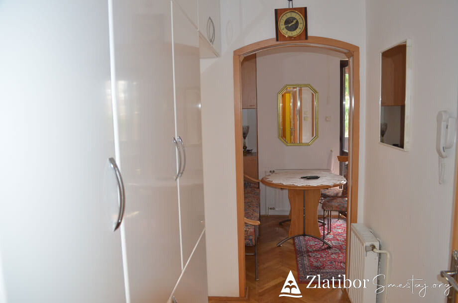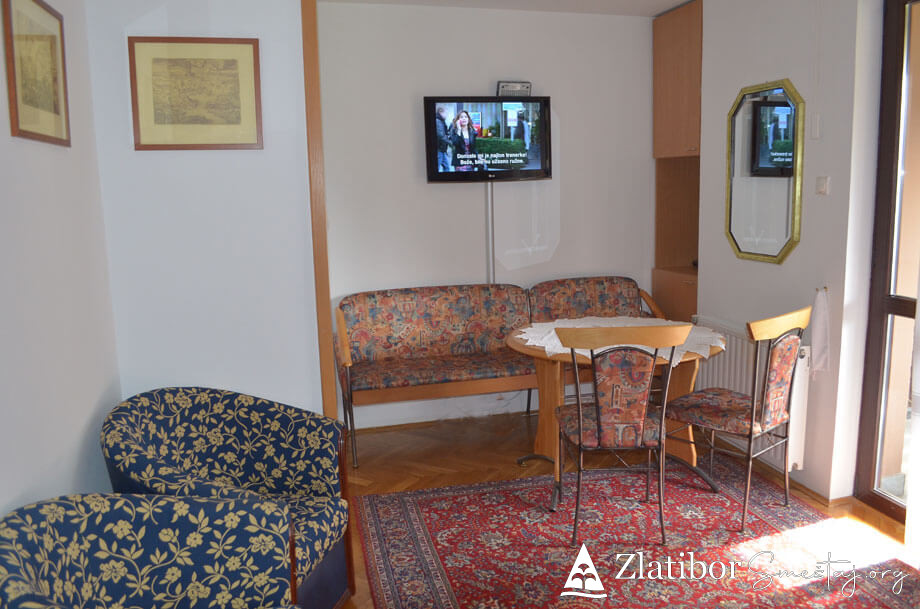 Apartman se nalazi u centru Zlatibora, 200m od hotela “Mona”. Apartman je komforan i kompletno opremljen, površine 46m². Bez obzira na blizinu centra, stan je diskretno ušuškan sa pogledom na manje dvorište i pogoduje adekvatnom odmoru u bilo kom periodu. Poseduje dnevni boravak sa trpezarijom i kuhinjom, spavaću sobu, kupatilo i terasu. Apartman je pogodan za smeštaj 4-5 osoba. Trenutno je na raspolaganju TV sa „Total TV“ paketom kanala, a u procesu je uvođenje interneta. Ispred zgrade gostima je na raspolaganju parking.