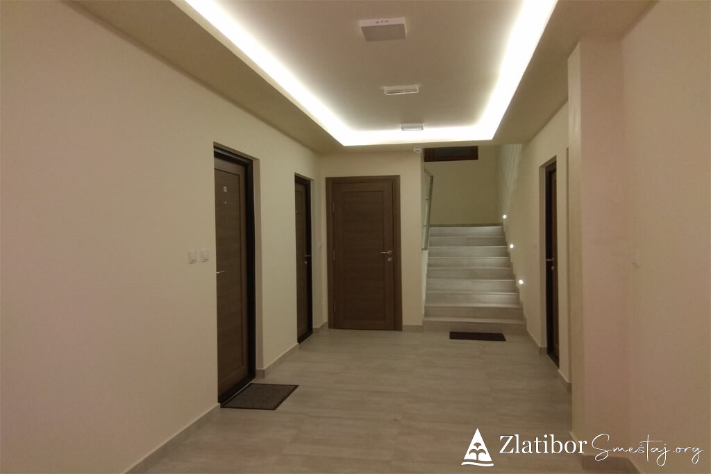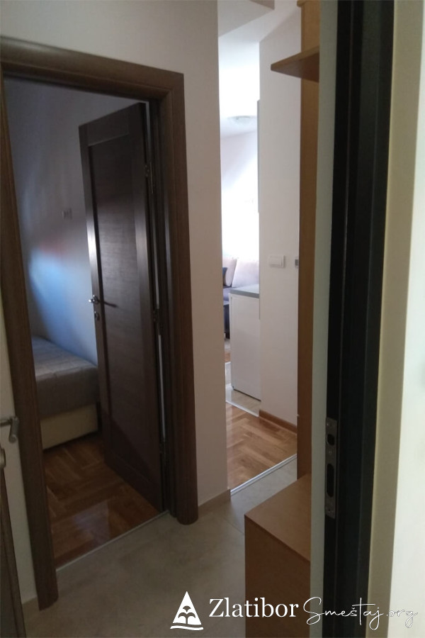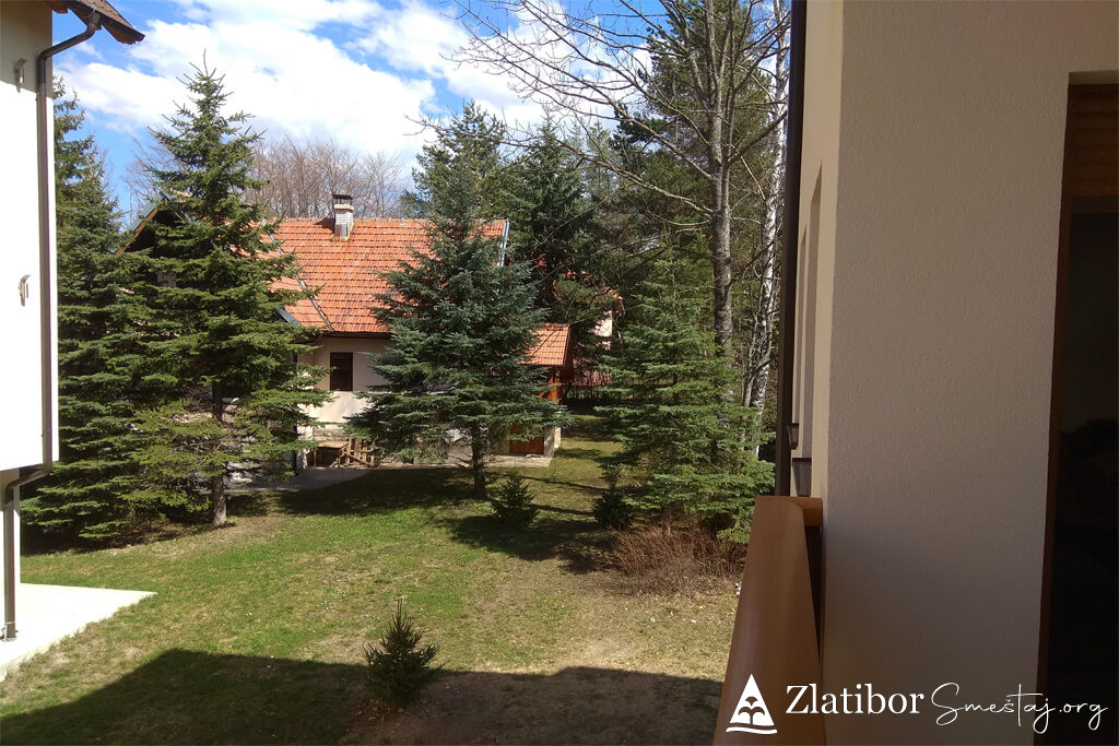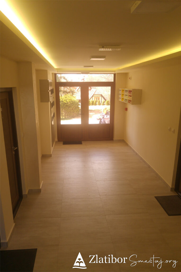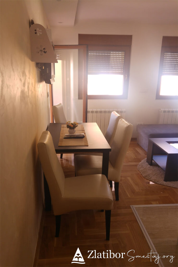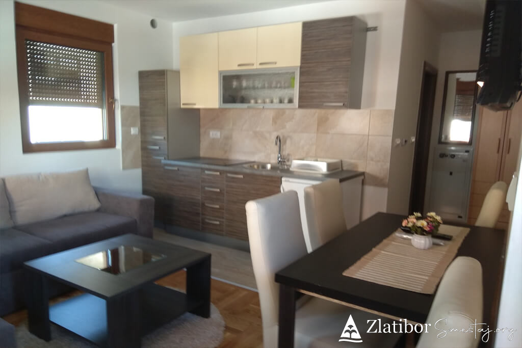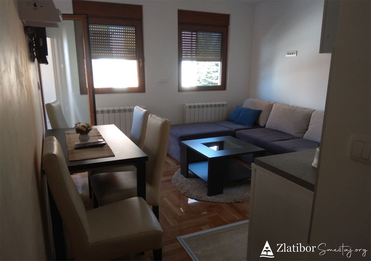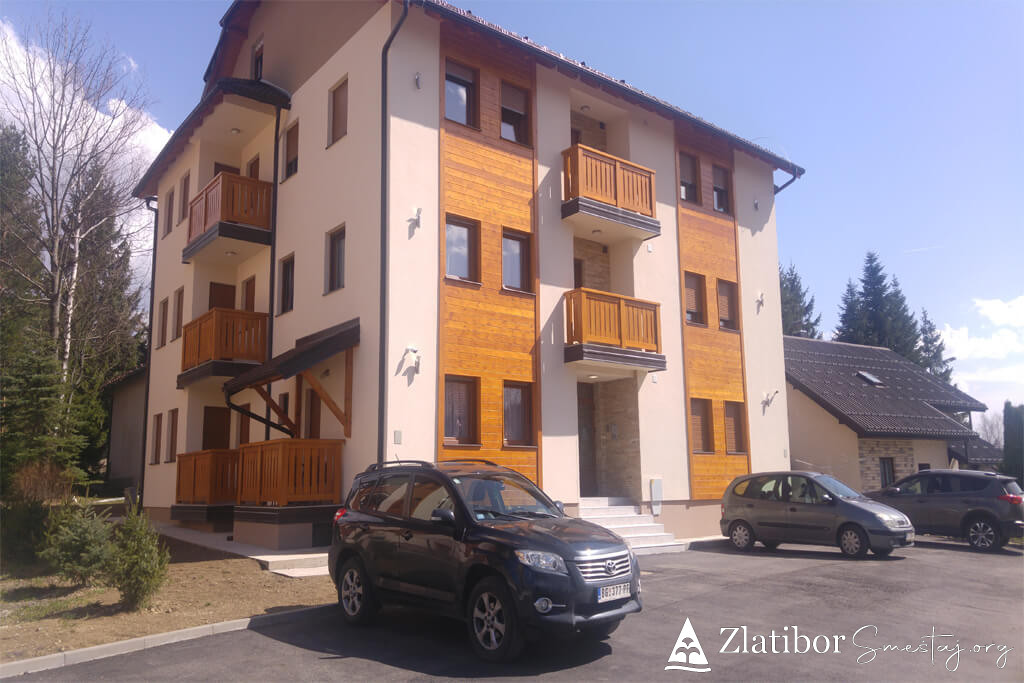 Udaljen je 1300m od centra Zlatibora, odnosno od Kraljevog trga. Apartman je nov. Prvi put useljen Januara 2018 god. Okružen je borovim stablima i jelkama što gostima pruža veoma prijatan i čist vazduh.