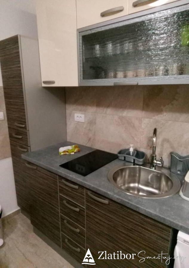 Kuhinja je opremljena: ravnom pločom sa dve ringle, frižiderom sa malom komorom za zamrzavanje, kompletnim posudjem sa priborom za rucavanje,staklenim časama, soljama za kafu i čaj.