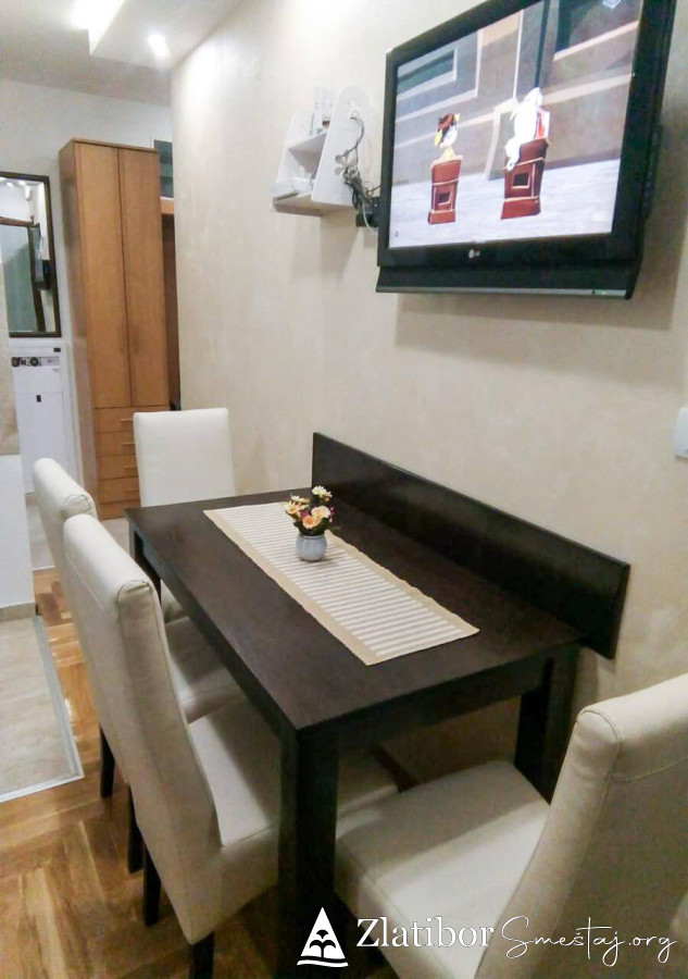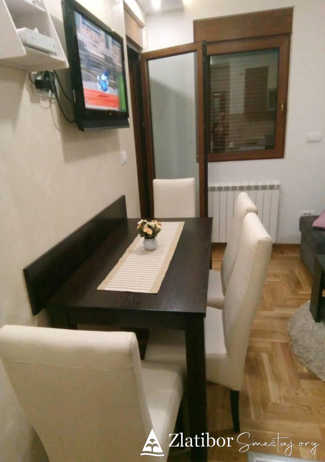 U dnevnoj sobi se nalazi veliki LCD televizor sa digitalnim kanalima, kao i sto i stolice za rucavanje.Besplatni WIFI internet je obezbedjen u sklopu apartmana.